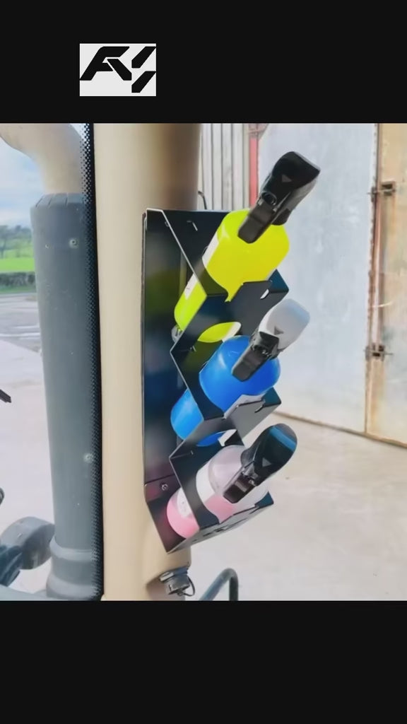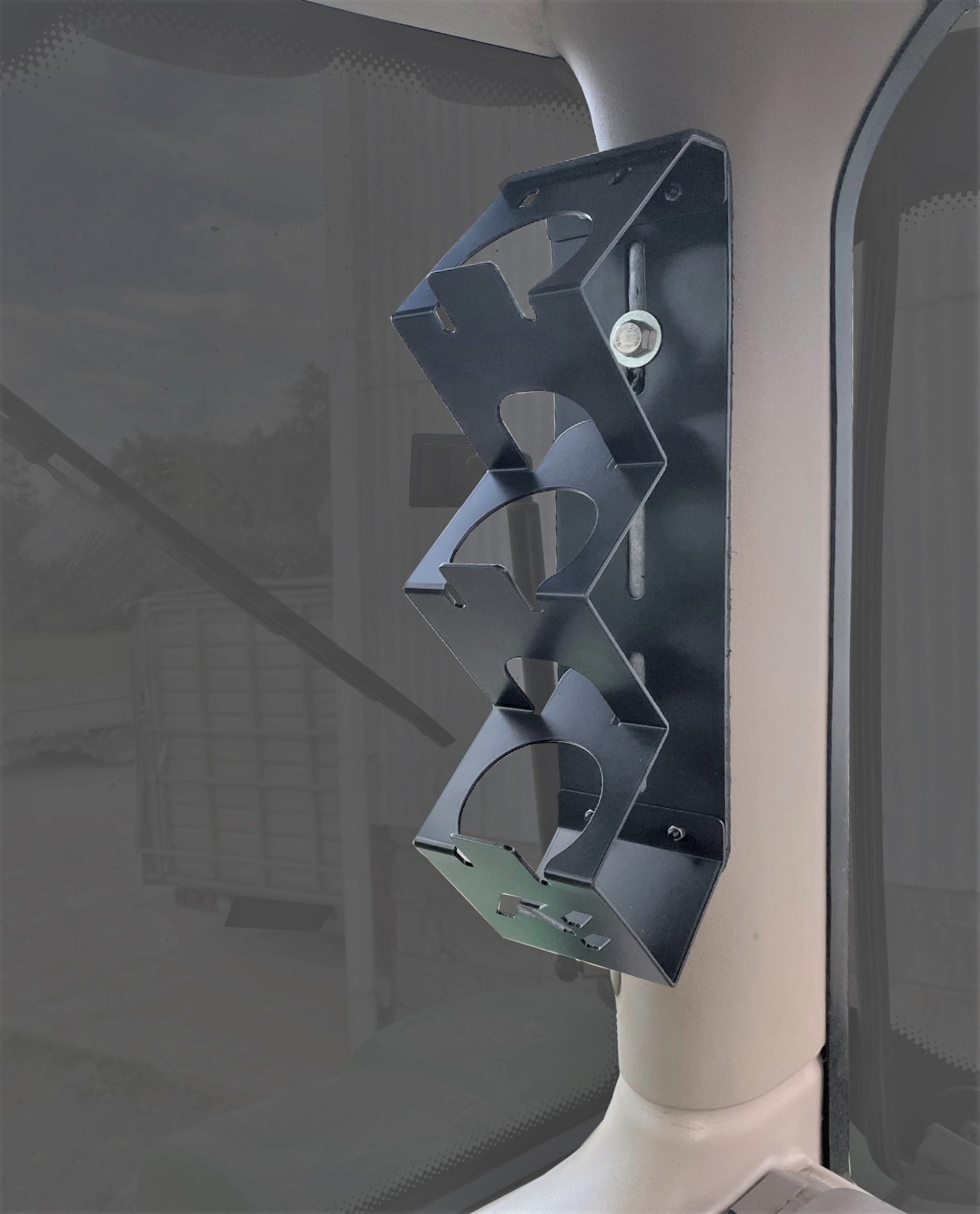 Please note: to ensure your bottle holder is suited for your tractor's cab, please state the make and model at checkout. This tractor bottle holder is designed for the storage of cleaning spray bottles. The vertical design against the tractor cab pillar minimises visibility obstruction for the operator whilst ensuring the bottles are always within reach. Whenever your tractor is dirty, your windscreen frosts up, or you want to freshen the air – your solutions are only one arm's reach away. Features:- Hold 3 up to 70mm in diameter.